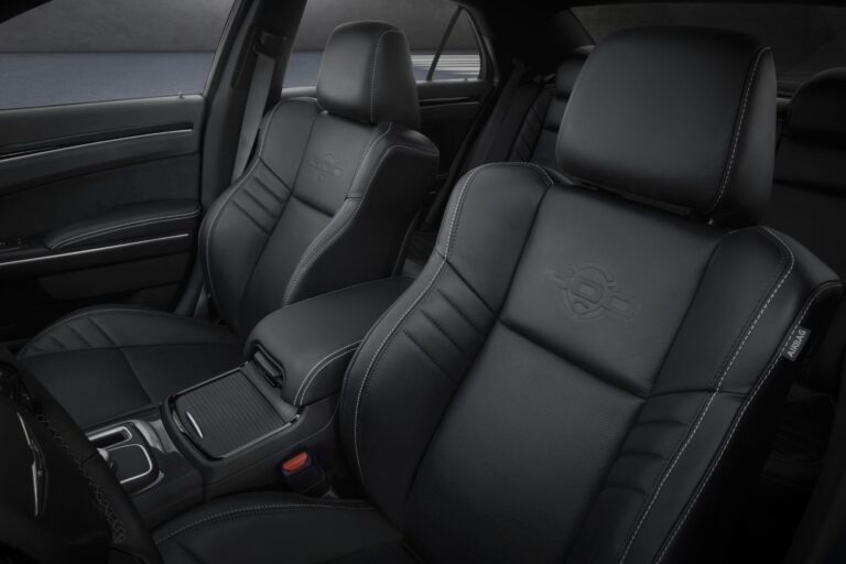 Wnętrze samochodu wyróżniają czarne skórzane fotele przednie z tłoczonym nowym logo 300C, dodatkowo ozdobione unikalnym srebrnym przeszyciem. Srebrne przeszycia znajdują się także na drzwiach i skórzanym panelu instrumentów, z elementami z włókna węglowego i pianowego czarnego wykończenia na wewnętrznych obramowaniach.