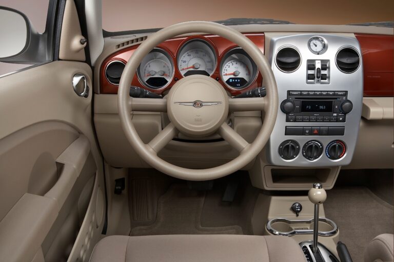 Wnętrze modelu 2007 Chrysler PT Cruiser Street Cruiser Pacific Coast Highway Edition to też świeży powiew, z dwóch odcieni: Slate Gray i Pastel Slate Gray. Fotele z tkaniny Albi II w średnim szarym kolorze ze wstawkami Ocean Blue pasują do zewnętrznej kolorystyki pojazdu i obejmują regulację elektryczną siedziska kierowcy w sześciu kierunkach oraz ręczną regulację lędźwi. Wykończenia drzwi w kolorze Pastel Slate Gray mają średnie szare winylowe wstawki. Panel przyrządów posiada obręcz w kolorze Satin Silver z Ocean Blue oraz pokrywę poduszki powietrznej pasażera w tym samym kolorze. Edycja Pacific Coast Highway oferuje również skórzaną kierownicę oraz wiele jasnych akcentów wewnętrznych, takich jak szprychy kierownicy w kolorze Satin Silver, pierścienie w uchwytach na kubki, pokrętła zamków drzwi, ozdobna obudowa zmiany biegów i gałka zmiany biegów. Jasne logo skrzydła Chryslera zdobi przednie osłony drzwi. Standardowe radio satelitarne SIRIUS utrzymuje kierowcę w kontakcie, nawet jeśli droga prowadzi poza zasięg radia komercyjnego. Standardowe radio AM/FM z odtwarzaczem CD ma możliwość odtwarzania MP3, a także gniazdo audio do podłączenia przenośnych odtwarzaczy MP3 lub innych urządzeń audio.