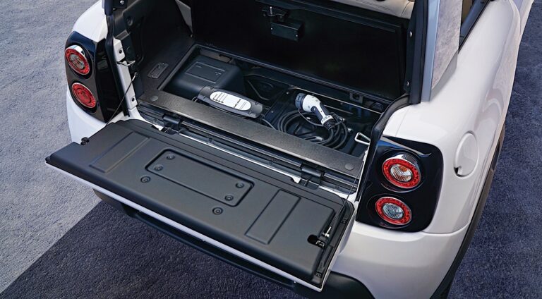 Praktyczny nowy Citroën E-Mehari ma nowe schowki na konsoli centralnej oraz w wewnętrznych panelach drzwiowych, a jego bagażnik oferuje bezpieczną komorę o pojemności 78 litrów, którą można zablokować. Ostatecznie, do transportu toreb, walizek i innego sprzętu rekreacyjnego na zakupy czy aktywny weekend, nowy Citroën E-Mehari ma jednoczęściową składaną tylną kanapę. Po złożeniu tylnej kanapy początkowa objętość bagażnika 200 litrów wzrasta do 800 litrów.