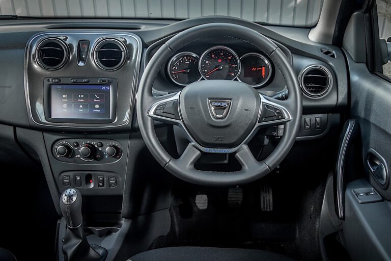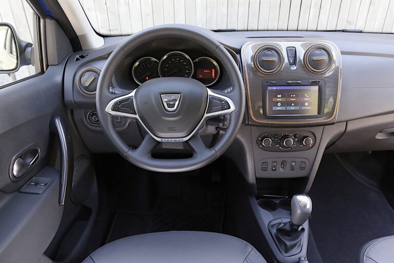 Nowy Logan MCV Stepway ma nową, czteroramienną kierownicę Dacii – z przyciskiem klaksonu na środku – wykończoną w miękkim dotyku, co sprawia, że jest bardzo trwała, estetyczna i przyjemna w dotyku. Przycisk na kierownicy został lepiej zintegrowany, co zapewnia bardziej przyjazne i komfortowe doznania podczas jazdy. W środku koła, pod logo Dacii, wyraz 'Stepway’ jest podświetlony na niebiesko.