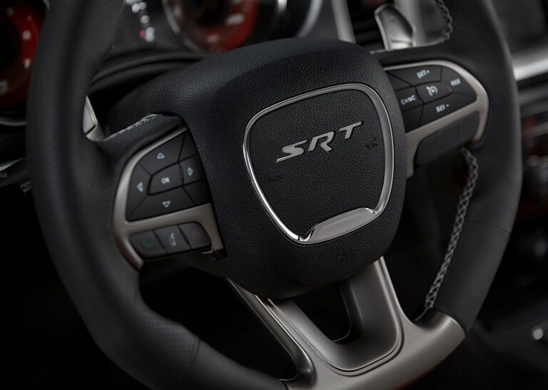 Przerobiona ogrzewana kierownica z logo SRT ma płaski dół i grubą obręcz dla wysokowydajnego kierowcy. Standardowe manetki zmiany biegów znajdują się na tylnej części górnych ramion. Przyciski do kontrolowania konfigurowalnego wyświetlacza TFT w pełnym kolorze są duże i podświetlane. Przyciski do dostępu do systemu Uconnect i telefonu znajdują się wzdłuż dolnej krawędzi poziomych ramion. Opcjonalny tempomat adaptacyjny konfigurowany jest za pomocą przycisków symetrycznie przeciwnych po prawej stronie kierownicy. Jak wcześniej, wysoko oceniane elementy sterujące audio znajdują się z tyłu górnych ramion. Ta nowa kierownica z regulacją wysokości i położenia również ma 360-stopniowy element grzewczy.