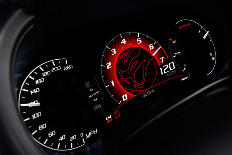 Zaprojektowany specjalnie dla SRT Viper 2013, nowy, 7-calowy, kolorowy, dostosowywany wyświetlacz zestawu wskaźników wykorzystuje całkowicie analogowy odczyt obrotomierza w centrum, aby potwierdzić filozofię informacji zwrotnej dotyczącej wydajności Viper. Kierowcy mają szeroki zakres opcji dostosowywania i osobistych, takich jak dodatkowy wyświetlacz cyfrowego prędkościomierza tuż poniżej obrotomierza. Informacje o pojeździe są jasno komunikowane za pomocą łatwych do zrozumienia ikon. Intuicyjnie kontrolowane przez prostą kontrolę za pomocą czterokierunkowego przycisku na kierownicy, kierowca może skonfigurować ekrany, aby wyświetlały informacje, które pragnie, łatwo miksując i dopasowując je.
