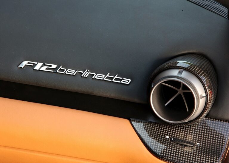 Kabina Ferrari F12berlinetta jest zaprojektowana w nowoczesnym stylu, który jest dyskretny, ale jednocześnie wyrafinowany. Objętości zostały zminimalizowane, aby zwiększyć sportowość i efektywność. Przestrzeń wnętrza została zoptymalizowana, aby zapewnić jednocześnie sportowe i komfortowe doświadczenie. Idealna równowaga pomiędzy nowoczesnymi technologiami a wyrafinowanym, pięknie wykonanym wykończeniem wnętrza z leżaczkiem Frau odzwierciedla wartości leżące u podstaw DNA Ferrari. Najsilniejszą cechą projektu jest logiczny, ergonomiczny układ różnych funkcji w kabinie: lekka i minimalistyczna architektura obejmuje i podkreśla interfejs człowiek-maszyna, który umieszcza wszystkie główne sterowania na kierownicy, a wszystkie istotne informacje wyświetla w głównym wskaźniku na wprost. Zlikwidowanie dźwigni kierunkowskazów i zgrupowanie wszystkich komend kierowcy na kierownicy podkreśla związek samochodu ze światem wyścigów. Bardziej ergonomiczne łopatki F1 oraz fakt, że kierowca może sięgnąć do każdego pojedynczego sterowania mając ręce trzymane mocno na obręczy kierownicy, zapewniają maksymalne osiągi w każdych warunkach jazdy. Deska rozdzielcza dominuje zaawansowanymi otworami wentylacyjnymi o nowym i innowacyjnym designie. Zainspirowane aeronautyką, są kompaktowe i wykonane z włókna węglowego oraz stopu aluminium. Opcjonalny wyświetlacz jest dostępny dla pasażera i aktywnie angażuje go w całe doświadczenie jazdy. Konsola tunelowa jest zarówno lekka, jak i funkcjonalna. Centralny mostek zawiera przyciski skrzyni biegów F1 i świateł awaryjnych, a także jest jednym z charakterystycznych elementów kabiny. Poniżej znajduje się wyłożona Alcantarą przestrzeń na drobiazgi, a także uchwyt na napoje. Konsola tunelowa kończy się długim regulowanym podłokietnikiem, który jest zawieszony z boku, aby ułatwić dostęp do schowka poniżej, gdzie znajduje się także wygodny port USB. Drzwi Ferrari F12berlinetta mają płynnie dynamiczną linię i po raz kolejny są zaprojektowane w oparciu o logiczny układ ich głównych cech: podłokietnik, uchwyt do drzwi, głośnik, głośnik, poduszka powietrzna i kieszeń ze skóry. Środkowa sekcja wykończenia panelu pozwala na dużą swobodę personalizacji zarówno w zakresie wykończenia, jak i materiałów. Opcje obejmują aluminiowe obramowania zaprojektowane w celu podkreślenia charakterystycznych linii panelu.