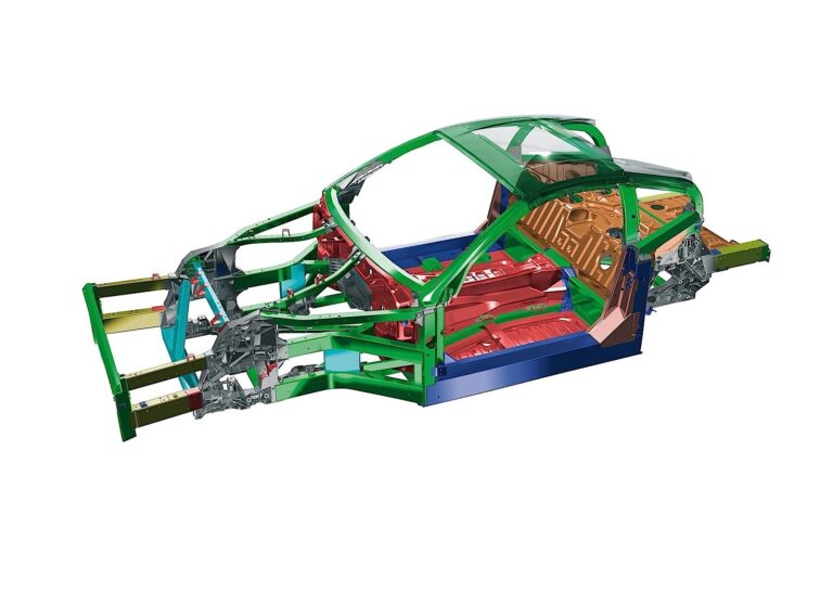 Ferrari F12berlinetta zapewnia niezwykłe osiągi i przyjemność z jazdy dzięki wysoce rozwiniętej architekturze transaxle, która została stworzona z niezwykle ambitnymi celami na uwadze. Cele te obejmowały zmniejszenie całkowitej wagi, obniżenie i przesunięcie środka ciężkości w tył podwozia oraz zmniejszenie powierzchni czołowej samochodu, jednocześnie zwiększając przestrzeń dla pasażerów i bagażu w porównaniu do poprzedniego coupé z silnikiem V12, aby zapewnić maksymalny komfort podczas dłuższych podróży. Aby osiągnąć te cele, inżynierowie obniżyli silnik, deskę rozdzielczą i siedzenia. Co więcej, tył pojazdu stał się bardziej kompaktowy dzięki przeniesieniu i zmniejszeniu rozmiaru zbiornika paliwa (co jest częściowo możliwe dzięki bardziej efektywnemu silnikowi, który zapewnia ten sam zasięg co wcześniej) oraz nowemu układowi transaxle, który umożliwił tylną wielowahaczową zawieszenie oraz skrzynię biegów F1 z zintegrowanym dyferencjałem elektronicznym. Zamiast tradycyjnego oddzielnego bagażnika, F12berlinetta ma obszerną klapę tylną, która łączy tylne okno, co przyczynia się zarówno do kompaktowości konstrukcji, jak i do przestronności bagażnika oraz łatwego dostępu do niego, zapewniając maksymalną sztywność strukturalną. Ta konstrukcja zapewnia także, że większa część masy samochodu znajduje się wewnątrz krótszego rozstawu osi, co korzystnie wpływa na dynamikę prowadzenia. Ostatecznym wynikiem jest samochód lżejszy o 70 kg, ze środkiem ciężkości obniżonym o 25 mm. Jest także krótszy (-47 mm), niższy (-63 mm) i węższy (-20 mm) w porównaniu do poprzedniego coupé z silnikiem V12. Tylny zwis został znacznie zmniejszony (-82 mm), podczas gdy przedni został wydłużony (+65 mm), aby pomieścić systemy chłodzenia wymagane dla potężnego silnika V12. Rozkład masy jest idealny – 54% na tylnej osi – i nie ma sobie równych wśród konkurencji w tym segmencie.