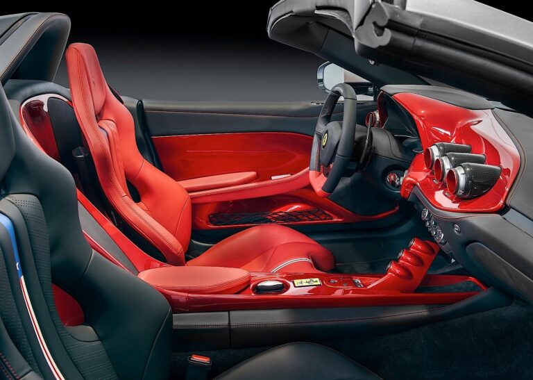 Asymetryczny design wnętrza podkreśla strefę kierowcy sportowymi, czerwonymi akcentami, podczas gdy strona pasażera jest czarna, inspirowana historycznymi samochodami wyścigowymi Ferrari. Wykończenie wnętrza jest ekskluzywne, a deska rozdzielcza, tunel i panele drzwi po stronie kierowcy są pokryte materiałami kompozytowymi. Fotele wyścigowe mają również stylizowany motyw amerykańskiej flagi na środku każdego fotela i oparcia.