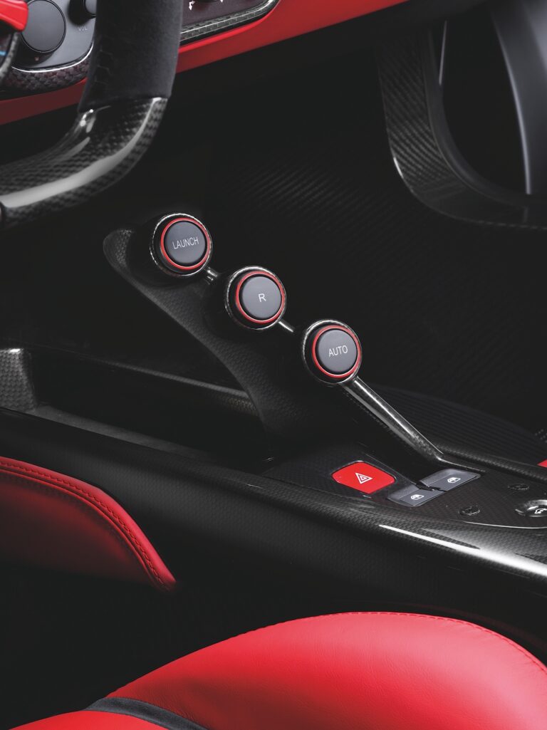 Wewnątrz znajduje się nowo zaprojektowana kierownica z wszystkimi głównymi poleceniami, a łopatki zmiany biegów są teraz dłuższe i bardziej ergonomiczne. Charakterystyczny mostek, na którym skupione są funkcje skrzyni biegów F1, przybrał smukły, zawieszony kształt skrzydła. Całe wnętrze ma zatem silnie torową, minimalistyczną aurę.