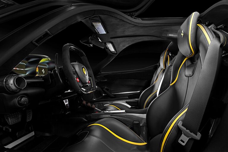 Układ wnętrza miał znaczący wkład w tym zakresie. Fotel jest stały i dopasowany do kierowcy, podczas gdy zarówno pedały, jak i kierownica są regulowane. Pozycja siedzenia przypomina tę w bolidzie jednoosobowym i została zaprojektowana po konsultacjach z kierowcami Scuderia Ferrari, Fernando Alonso i Felipe Massą, którzy aktywnie uczestniczyli w całym procesie rozwoju.