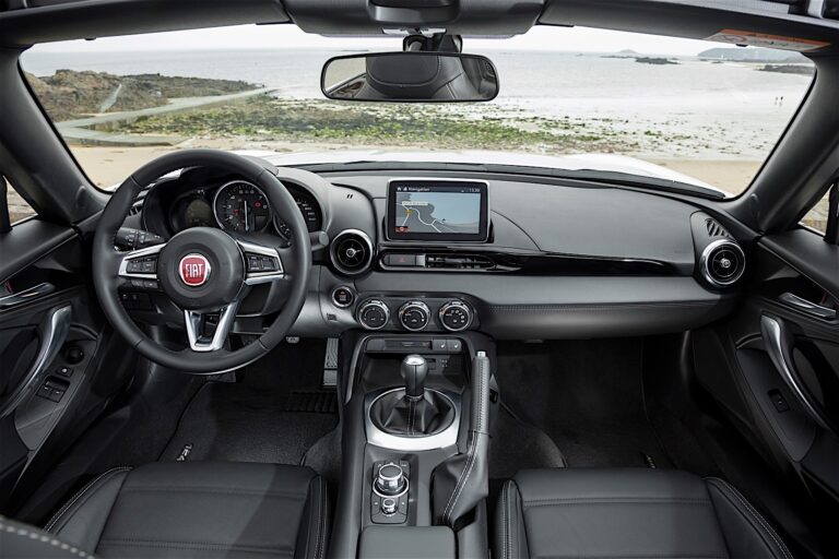 Z drugiej strony, kokpit był w 99% z Mazdy, a różnica 1% polegała na logo Fiata na kierownicy. Ale to nie było złe, ponieważ japoński producent wiedział, jak stworzyć odpowiednie wnętrze dla roadstera. Fotele z wysokimi bokami zapewniały doskonałe wsparcie boczne podczas szybkiego pokonywania zakrętów, a ekran infotainment był umieszczony na górze centralnej konsoli.