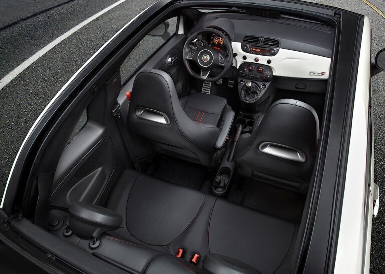 W środku, pomimo niewielkich rozmiarów samochodu, producent znalazł sposób na zapewnienie wystarczającej przestrzeni dla pasażerów z przodu. Zarówno kierowca, jak i pasażer obok siedzieli na wysoko podpartych fotelach z wysokimi oparciami i zintegrowanymi zagłówkami. Nie było znaczących zmian w zestawie wskaźników, ale Abarth dodał obrotomierz zamontowany na kolumnie kierowniczej. Inne ulepszenia były widoczne na kierownicy z płaskim dnem, ozdobionej tym samym znaczkiem „Scorpione”, co zewnętrze pojazdu. Na konsoli centralnej, 500C miał dźwignię zmiany biegów, którą Abarth ozdobił nową gałką biegów z czerwonymi oznaczeniami. Z przodu pasażera producent umieścił napis 500C na desce rozdzielczej, która miała ten sam kolor co nadwozie samochodu. Z tyłu prawie nie było miejsca dla pasażerów, chociaż przy złożonym dachu sytuacja była nieco lepsza.