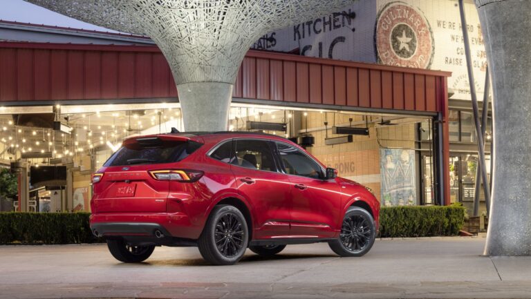 SUV Escape 2023 standardowo wyposażony jest w nowe reflektory LED z sygnaturowym oświetleniem. Wewnątrz jest wystarczająco miejsca dla pięciu osób, a tylne siedzenie może przesuwać się o prawie 15 cm – wystarczy przesunąć je do przodu, aby uzyskać więcej miejsca na bagaż lub przesunąć do tyłu dla większej przestrzeni na nogi.