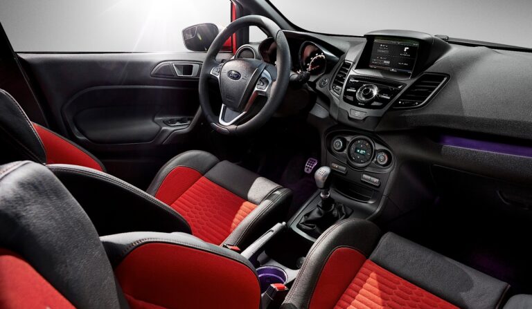 Wewnątrz, przednie fotele kubełkowe miały wysokie oparcia, co było kluczowe podczas szybkiego pokonywania zakrętów. To była jedyna dużą różnicą w porównaniu do reszty gamy Fiesty. Był dobrze wyposażony, z systemem infotainment Ford SYNC i funkcją kontroli rodzicielskiej, dzięki czemu kierowca nie mógł podkręcić głośności zbyt wysoko. Z tyłu było jeszcze mniej miejsca na nogi dla pasażerów, ponieważ przednie fotele były większe.