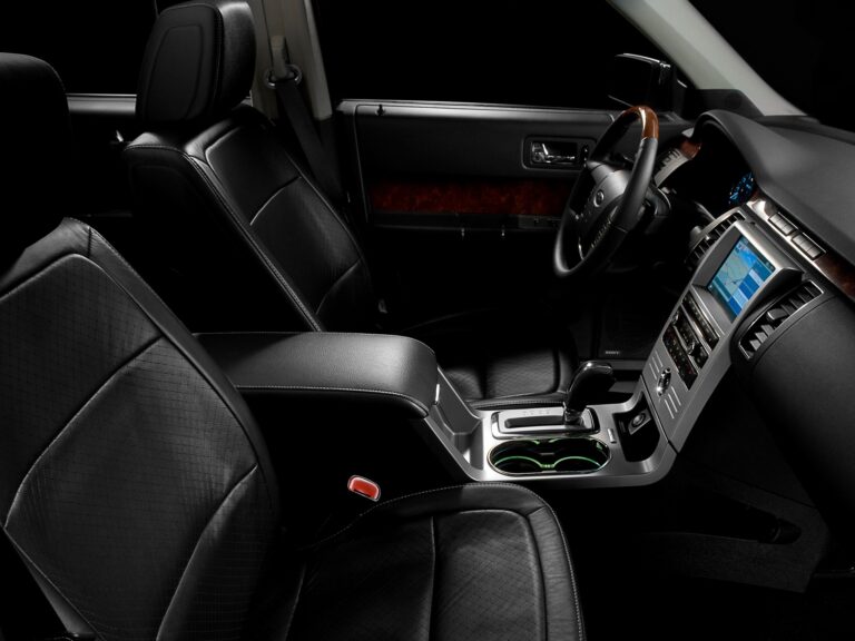 Szczegóły obejmują tkaninę przypominającą tweed w fotelach podstawowego modelu Ford Flex SE, z wstawkami w miniaturowy wzór houndstooth. Z kolei model Flex SEL ma miękką wstawkę z bardziej wyraźnym splotem na bocznych podparciach foteli, podczas gdy Flex Limited wyróżnia się unikalnymi perforacjami w diamentowy wzór na wstawkach skórzanych siedzeń. Kontrastowe szwy są również dostępne na skórzanych siedzeniach i konsoli centralnej.