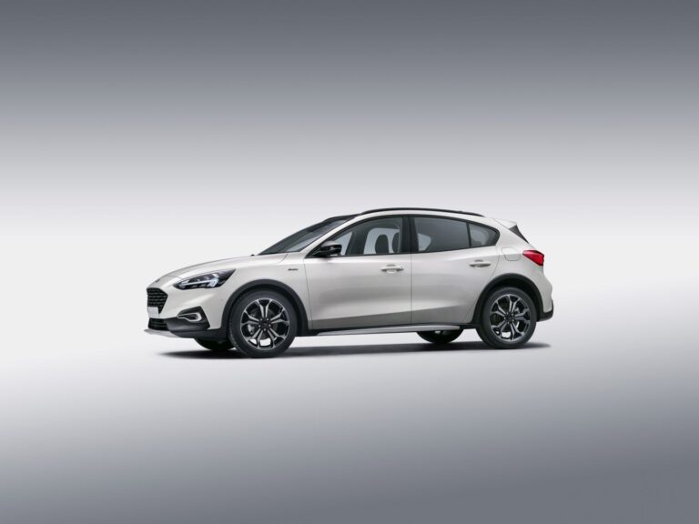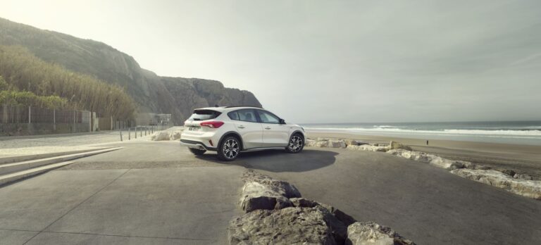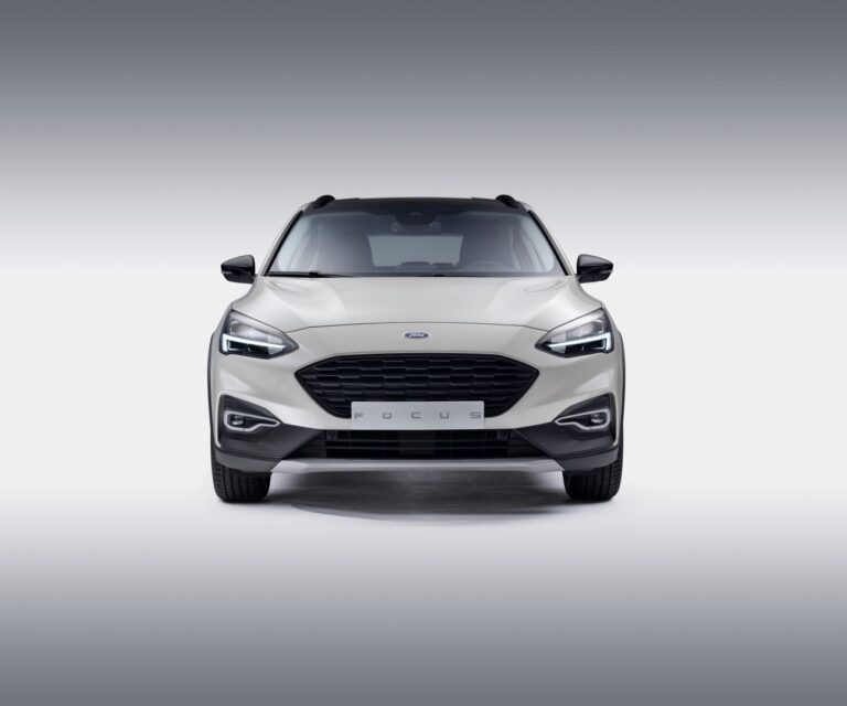 Ford Focus Active z podwyższonym prześwitem i ochronnymi czarnymi osłonami nadkoli oraz rockerami; osłony przednie i tylne oraz wkładki rockerów malowane w kontrastowym srebrze; oraz unikalny projekt przedniej części