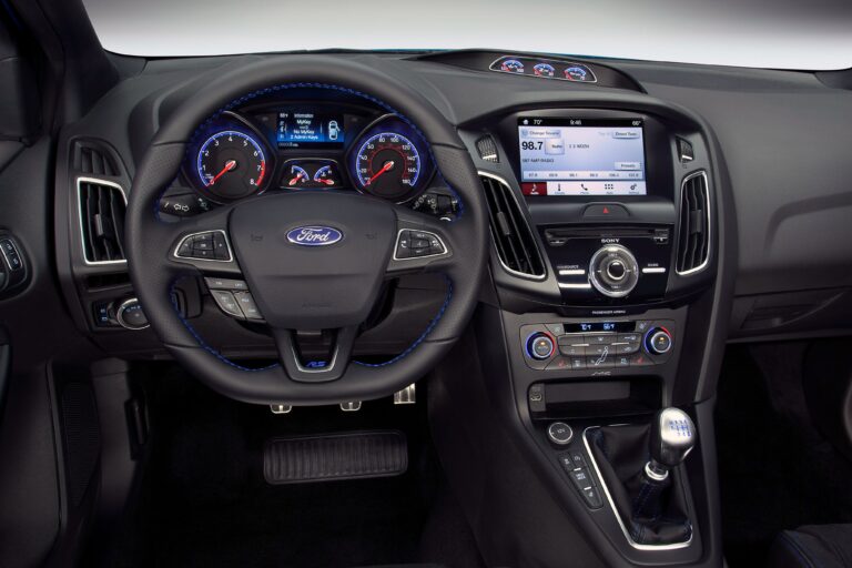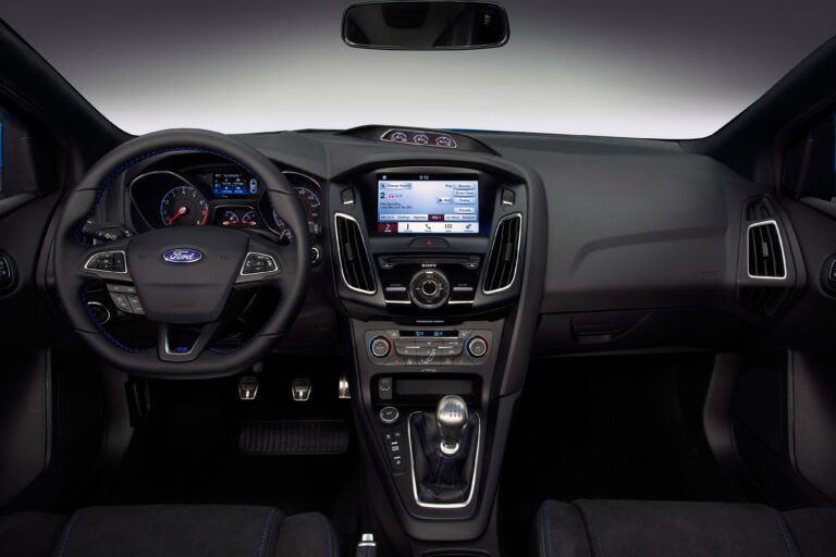 Wnętrze charakteryzuje się przeprojektowanym układem sterowania Focusa z prostszym, bardziej intuicyjnym designem. Łączność SYNC zapewnia dostęp do systemu audio, nawigacji, klimatyzacji i telefonów komórkowych za pomocą poleceń głosowych oraz poprzez wysokiej rozdzielczości 8-calowy kolorowy ekran dotykowy. Proste polecenia głosowe, takie jak „Znajdź tor wyścigowy”, umożliwiają właścicielom RS uzyskanie natychmiastowych wskazówek do najbliższego publicznego toru. SYNC można również wyposażyć w kamerę tylną z kontrolą odległości parkowania, a także w premium system audio Sony z 10 głośnikami, w tym subwooferem.