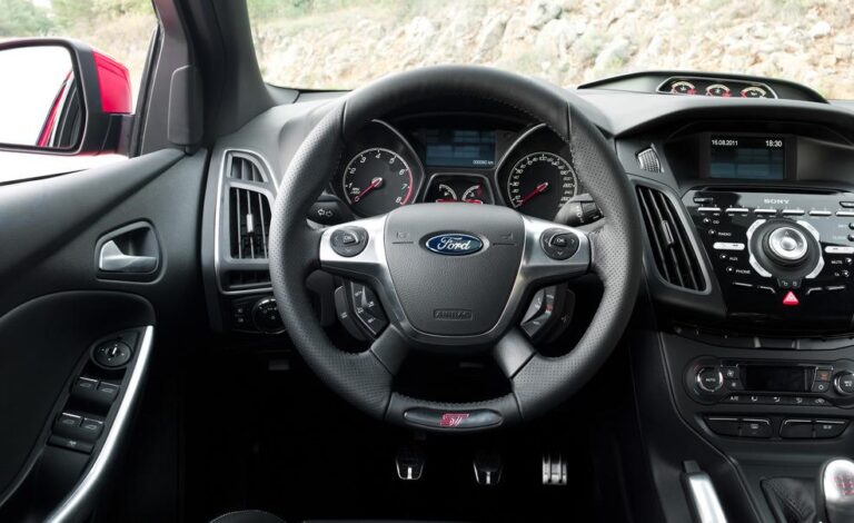 W całej kabinie unikalne detale zapewniają, że Ford Focus ST jasno sygnalizuje swoje sportowe intencje. Trzy dodatkowe wskaźniki dotyczące doładowania turbosprężarki, ciśnienia oleju i temperatury oleju znajdują się w dedykowanym panelu na górnej desce rozdzielczej; zestaw wskaźników ma unikalne sportowe grafiki ST z czerwonymi wskaźnikami; a centralna konsola ma wykończenie w efekcie węgla.