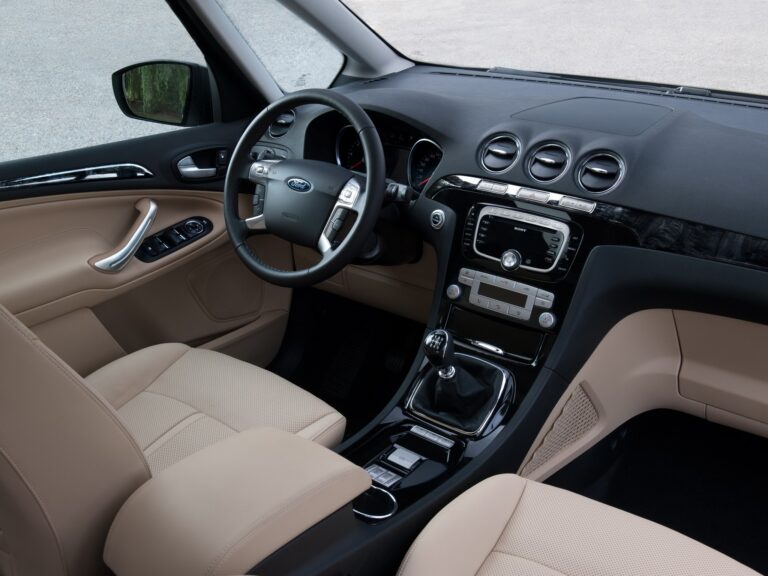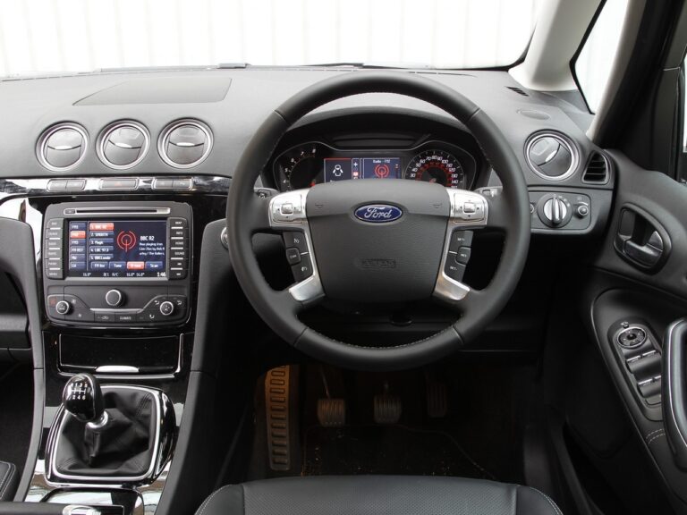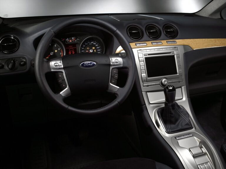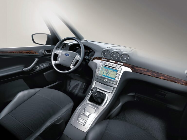 W środku Galaxy wyposażono w nową, łatwą do odczytu deskę rozdzielczą oraz skórzaną kierownicę z zamontowanymi przyciskami do obsługi systemu Human Machine Interface Forda.