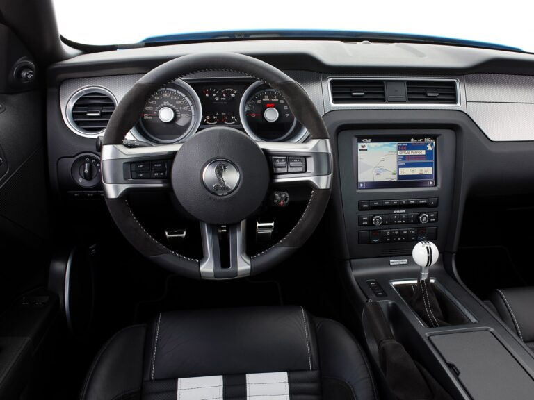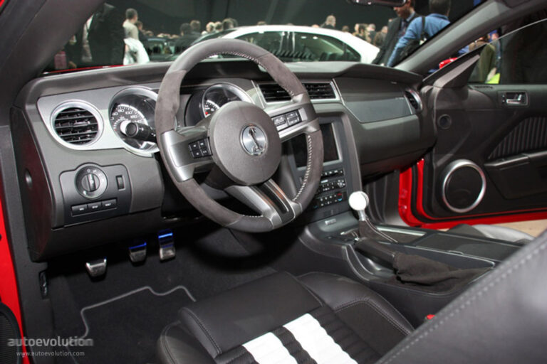 Napisy Shelby GT500 i obraz Cobra są powtarzane na klapce kierownicy. Za kierownicą wskaźniki mają jasne tła, zgodnie z tradycją SVT. Chromowane akcesoria w kabinie zostały zastąpione satynowym wykończeniem aluminiowym, w tym aluminiowym gałka dźwigni zmiany biegów, która jest dobrze umiejscowiona dla szybkich i pewnych zmian.