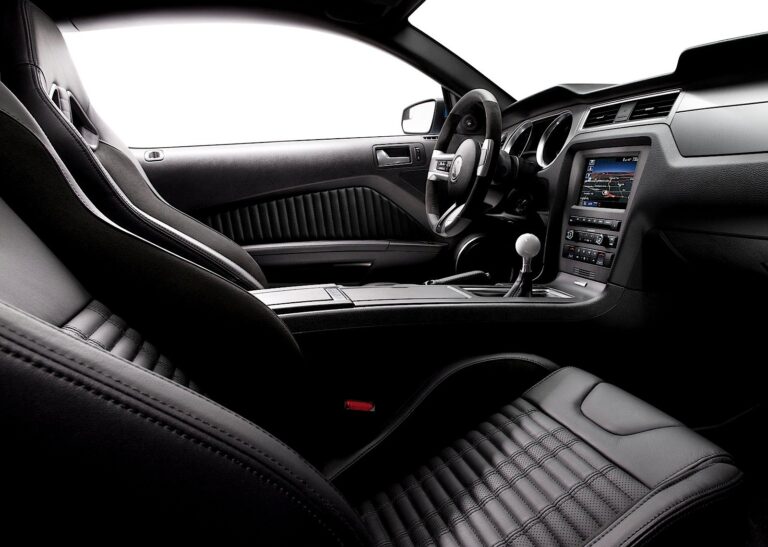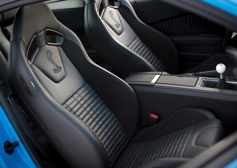 Wewnątrz sportowe siedzenia były ozdobione słynnym logo Shelby Cobra na oparciach. Co więcej, to samo logo zastąpiło klasyczny niebieski emblemat na kierownicy. Jednocześnie deska rozdzielcza zachowała ten sam układ jak w wersjach nieresztowych Mustanga. Dodatkowo, system multimedialny zyskał nowe funkcje ukierunkowane na osiągi. Z tyłu Ford zamontował kanapę dla dwóch osób, która oferowała mniej miejsca niż w innych standardowych Mustangach z powodu rozmiaru przednich siedzeń.