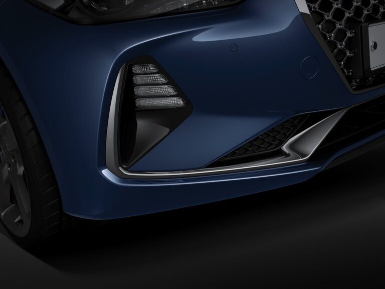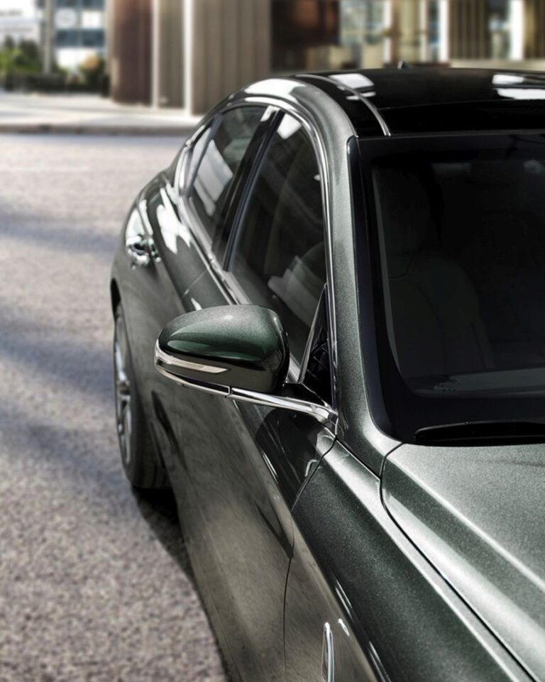 Z przodu nowy Genesis G70 zyskuje charakterystyczne dla marki reflektory Quad, wyposażone w super cienkie lampy LED, które rozciągają się na zewnątrz jak skrzydła emblematu Genesis. Niska kratka grilla Crest emanuje agresywną postawą, podkreślającą sportowy charakter G70.