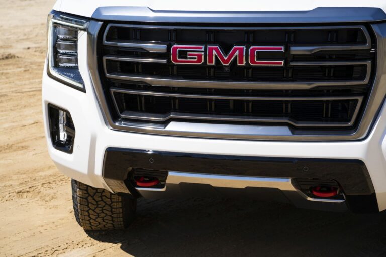 Yukon AT4 miał takie same reflektory LED jak jego rodzeństwo, ale zamiast chromowanej atrapy, prezentował masywną czarną kratkę, wystarczająco dużą, by pełnić funkcję bramy. Inżynierowie podnieśli dolną część zderzaka i zainstalowali prawdziwą osłonę pod komorą silnika. Dzięki temu dużemu SUV-owi udało się osiągnąć kąt natarcia wynoszący 32 stopnie. Zestaw dwóch, łatwo zauważalnych, czerwonych haków holowniczych przypominał właścicielowi, że potężny pojazd może utknąć.
