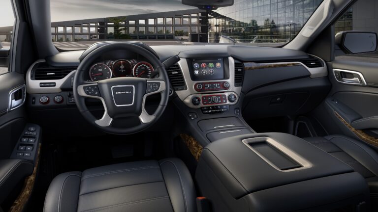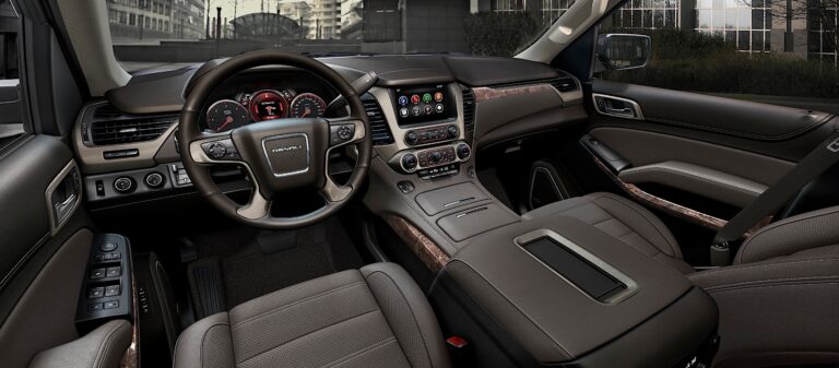 Wewnątrz, precyzyjnie wykonane wnętrze nowego Yukona 2015 oferuje ciche kabiny, autentyczne materiały oraz premium opcje infotainment. Przykłady obejmują materiały z miękkiego dotyku na desce rozdzielczej, konsoli i panelach drzwiowych z widocznymi szwami oraz celowe wykorzystanie oświetlenia otoczenia w funkcjonalnych obszarach, w tym wnękach na nogi w pierwszym i drugim rzędzie oraz w konsoli środkowej. Wszystkie modele mają standardowy system audio Bose, siedzenia z pianką o podwójnej twardości oraz wentylację powietrza, zaprojektowaną z myślą o komforcie pasażerów na przednich siedzeniach.