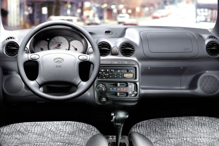 Wewnątrz, deska rozdzielcza miała otwartą przestrzeń do przechowywania z przodu po stronie pasażera. Kierowca zyskał z kolei zestaw wskaźników z trzema tarczami, z prędkościomierzem otoczonym z boku niecodziennie dużymi wskaźnikami temperatury płynu chłodzącego i poziomu paliwa. W zależności od poziomu wyposażenia, Atos oferował system audio zainstalowany w centralnej konsoli oraz klimatyzację. Hyundai umieścił sterowanie klimatyzacją poniżej radia. Z tyłu, Hyundai zachował kanapę dzieloną w proporcji 50/50, która była składana i chowana.