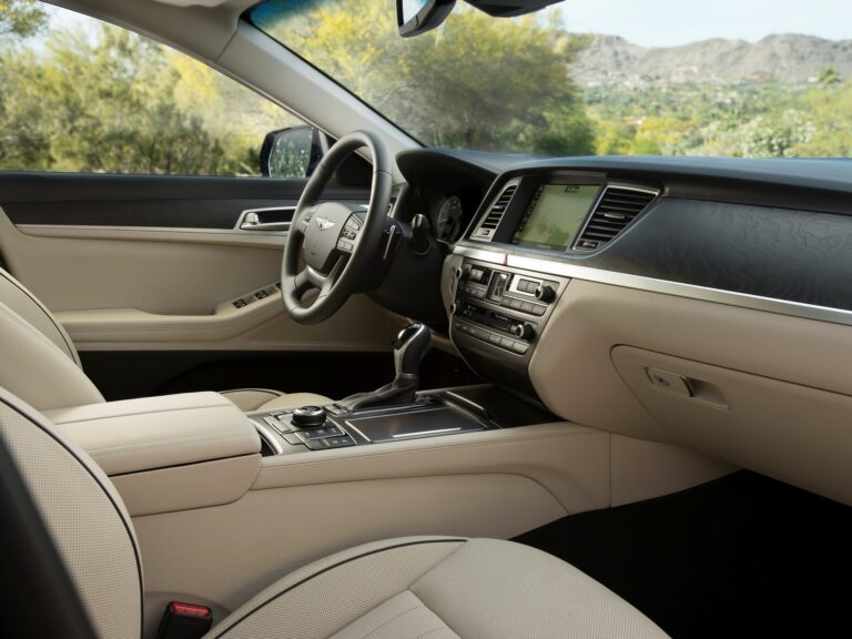 Nowy wzór wewnętrzny został wprowadzony, aby zmniejszyć odblaski oraz rozjaśnić powierzchnie deski rozdzielczej, a także dostępne są materiały wysokiej jakości, takie jak prawdziwe aluminium i drewno o matowym wykończeniu. Spójność między centralną częścią a kontrolkami audio została zapewniona dzięki uproszczonemu designowi, co sprawia, że dwie osobne sekcje wyglądają na jedną całość. Aby zapewnić luksusowe odczucie, Genesis był intensywnie analizowany pod kątem użycia materiałów, z rozbudowaną analizą relacji między różnymi materiałami, ich fakturą i koordynacją kolorystyczną.