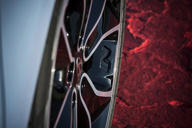 Hyundai i30 N ma zwiększone nadkola z 18-calowymi lub unikalnymi 19-calowymi kołami, na których znajduje się logo N. W porównaniu do wersji pięciodrzwiowej, i30 N jest niższy o 4 mm przy 18-calowych kołach i o 8 mm przy 19-calowych kołach. Podpis N można także znaleźć na rzucających się w oczy czerwonych zaciskach hamulcowych oraz na kratce Cascading Grille z przodu. Wyraźnie wskazuje, skąd pochodzi model i zwiększa wrażenie wysokich osiągów.
