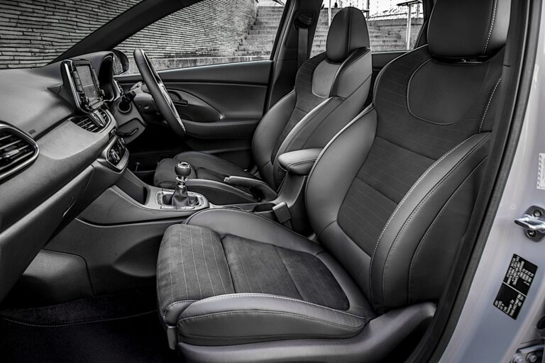 Hyundai i30 N ma unikalnie zaprojektowane sportowe fotele wysokowydajne z dużym wsparciem lędźwiowym. Rozsuwane poduszki siedzeń dodatkowo poprawiają stabilność i komfort dla kierowcy i pasażera z przodu. Klienci mogą wybierać spośród kombinacji zamszu i skóry lub materiału. Oba warianty mają wyróżniające się, wytłoczone logo N na oparciu.