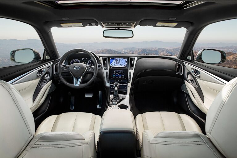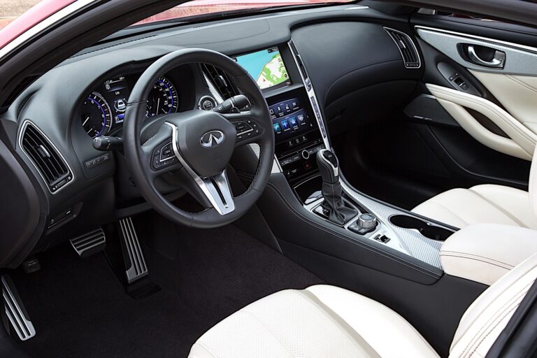 Podejście skoncentrowane na kierowcy kontynuuje się wewnątrz Q60, z nowymi wykończeniami wnętrza z wysokiej jakości akcentami i odważnymi, nowoczesnymi materiałami. Model podstawowy otrzymuje aluminium, podczas gdy dostępna jest także opcja czarnego drewna. Modele Sport i Premium są dostępne z akcentami z włókna węglowego, natomiast wersje z białą lub czerwoną tapicerką skórzaną mają akcenty z włókna szklanego o kolorze srebrnym.