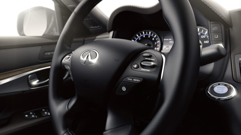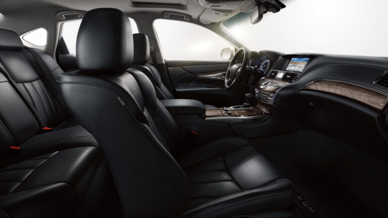 Na przykład panel instrumentów zawiera wskaźniki Fine Vision, pierścienie w kształcie zębatki na wskaźnikach, wyświetlacz informacji o pojeździe o przekątnej 7,0 cala oraz analogowy zegarek Infiniti. Fotele kierowcy i pasażera z przodu z wykończeniem skórzanym, podgrzewane z 10-stopniową regulacją elektryczną, w tym 2-stopniowym wsparciem lędźwiowym są standardem, a także podwójny system pamięci dla fotela kierowcy, kierownicy i lusterek bocznych – który może być powiązany z indywidualnymi inteligentnymi kluczami.