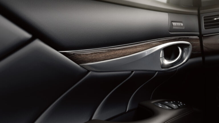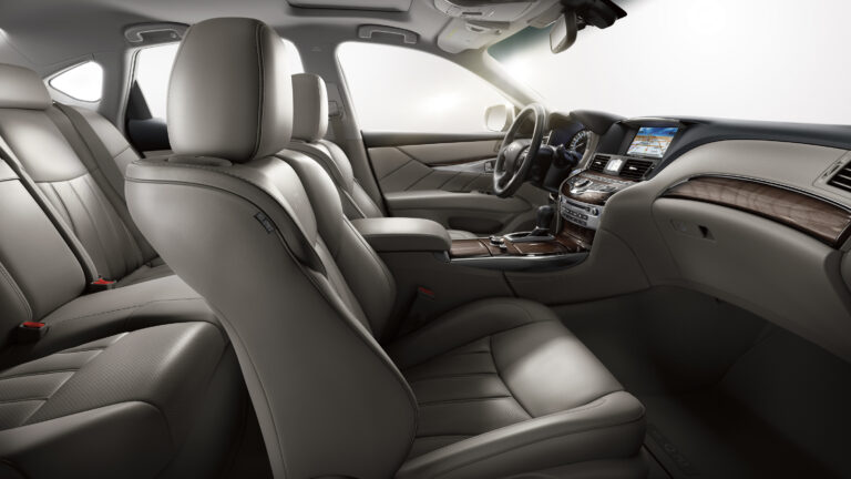 Pakiet Deluxe Touring charakteryzuje się również skórą semi-anilinową – skórą pełnoziarnistą, która zawiera niewielką ilość powłoki powierzchniowej, co pozwala naturalnym cechom skóry przejść na wierzch. Fotele są miękkie i jędrne, jak materiał na luksusową sofę, i oferowane są w trzech dostępnych kolorach – grafitowym, kawowym lub kamiennym. W pakiecie Deluxe Touring znajdują się również specjalnie opracowane materiały o soft touch na podłokietnikach, wstawkach drzwiowych, konsoli środkowej i poduszkach kolanowych. Specjalne wykończenie drzwi z prawdziwego drewna białego jesionu zostało wzbogacone prawdziwym srebrem w proszku (wykończenie z drewna japońskiego jesionu oferowane jest w modelach Q70 bez pakietu Deluxe Touring).