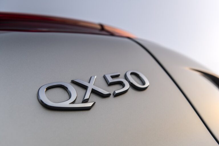 Dodatkowo, środek dachu QX50 jest subtelnie wklęsły w kierunku tyłu pojazdu, a boczny spoiler (łączący boki tylnego spoilera z tylną szybą) oraz zdefiniowana krawędź tylnego zestawu lamp łączą się, przyczyniając się do projektu bez podnoszenia.