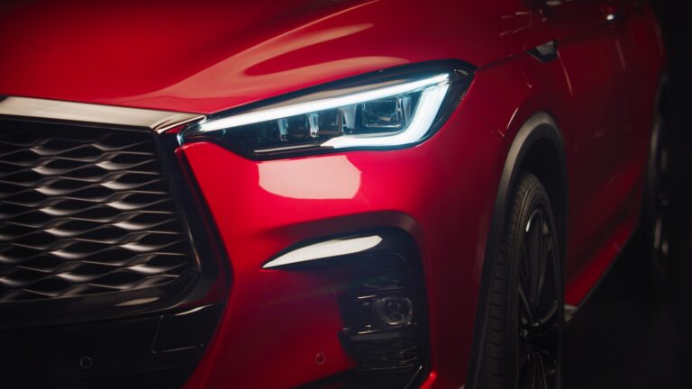 Z przodu, podwójna kratka Infiniti QX55 jest wyraźna i unikalna, ogłaszając przybycie pojazdu. Jej głębokość geometrycznej siatki inspirowana jest zagięciami japońskiego origami – gdzie materiał 2D jest składany, aby stworzyć głębię – i nadaje pojazdowi pewny i prowokujący wygląd. Wyraźna kratka otoczona jest charakterystycznymi dla Infiniti reflektorami w kształcie ludzkiego oka, które są tak intensywne, jak i pociągające. Unikalny kształt przypomina brwi, a standardowe reflektory LED w QX55 emitują większą szczegółowość dzięki swojemu jasnemu światłu w porównaniu do reflektorów halogenowych czy ksenonowych.