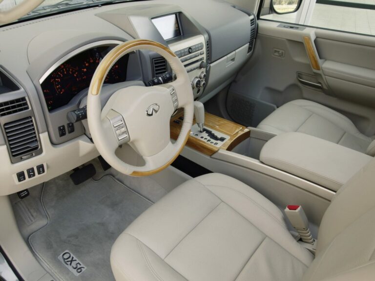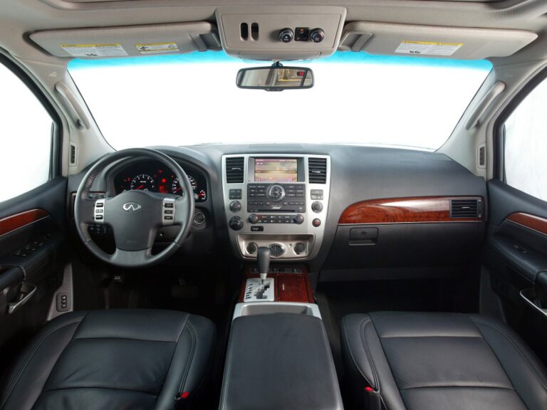Wnętrze QX56 oferowało siedem miejsc w układzie 2-2-3. Z przodu, wysoka i szeroka deska rozdzielcza miała centralny panel do systemu audio i klimatyzacji, z wyświetlaczem nawigacyjnym umieszczonym na górze. Zestaw wskaźników miał okrągły kształt i składał się z czterech tarcz – prędkościomierza i obrotomierza w środku, a po bokach wskaźników temperatury płynu chłodzącego i poziomu paliwa. W przeciwieństwie do innych producentów, Infiniti nie oferowało różnych poziomów wyposażenia; od samego początku montowano wszystko, więc nikt się nie skarżył. Skórzane wnętrze i fornirowane wykończenia były standardowymi elementami, podobnie jak kamera cofania.