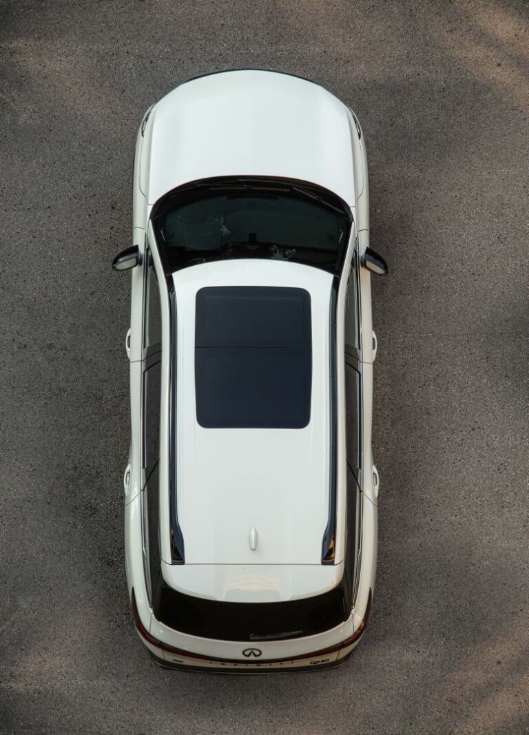 Niezauważona linia biegnie długości QX60, dzieląc dostępną, atrakcyjną, dwutonową karoserię od jej dolnej części. Czarny dach – pierwszy w Infiniti – wizualnie sięga w stronę tylnych kół i podkreślony jest chromowanymi akcentami, które otaczają rozległe okna.