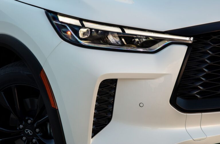 Przyciągający wzrok chrom otacza charakterystyczną kratkę i sięga ku rogom w charakterystycznych lampach LED w kształcie klawiszy pianina, które są standardowe we wszystkich wersjach QX60.
