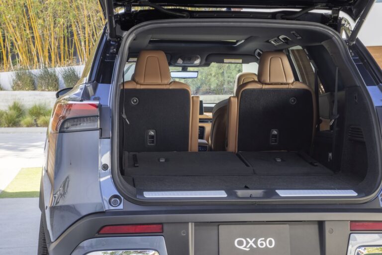 Dzielenie się, składane siedzenia w drugim i trzecim rzędzie składają się, aby stworzyć prawie płaską przestrzeń ładunkową za kierowcą i pasażerem z przodu. Po złożeniu trzeciego rzędu do przodu, nowa QX60 pomieści 41,6 stopy sześcienne ładunku – więcej niż jej poprzednik – i mieści 54,1 litrów w podłogowym schowku, co stanowi poprawę o niemal 21 litrów w porównaniu do poprzedniego modelu.