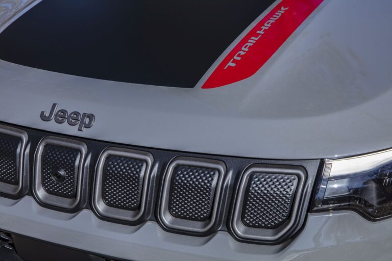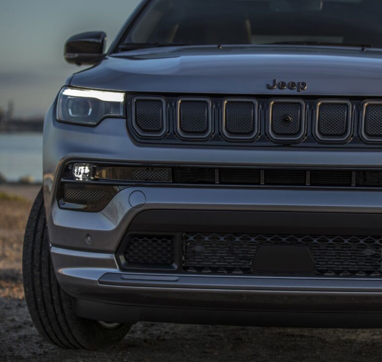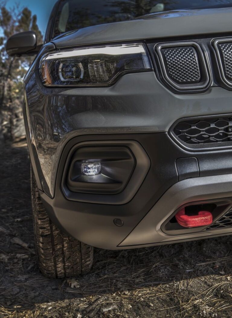 Projektanci zrewolucjonizowali wygląd legendarnej kratki Jeepa, podnosząc jej pozycję wertykalną i dzieląc ją na dwie poziome sekcje. Zintegrowano w niej nowe pełne LED-owe reflektory o smukłym profilu (standard we wszystkich wersjach). Dostępne w trzech różnych typach, nadają Nowemu Compass bardziej odważny wygląd. Światła do jazdy dziennej (DRL) – obecnie charakteryzujące się subtelną, wydłużoną formą – również zostały przemieszczone i są teraz wbudowane w główne reflektory. Dolna szczelina oraz osłona przednia są szersze i bardziej widoczne.