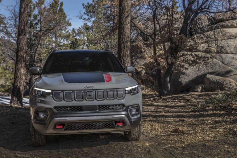 Od przodu, Jeep Compass 2022 pochwalił się nowym grillem, który miał akcenty w kolorze fortepianowej czerni wokół charakterystycznego dla marki, siedmiolistnego grilla. Dodatkowo, producent stworzył nowe reflektory z diodowymi światłami dziennymi wbudowanymi w górnej części, co nadawało samochodowi bardziej agresywny wygląd. Na dolnej części zderzaka producent zaoferował diodowe lampy przeciwmgielne, które towarzyszyły szerokiemu wlotowi powietrza umieszczonemu pośrodku. Jeep dodał również osłonę podwozia dla wersji Trailhawk modelu Compass.