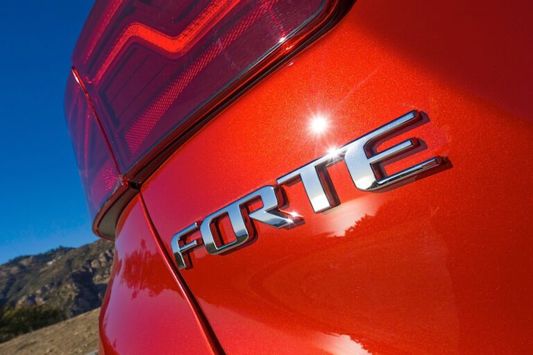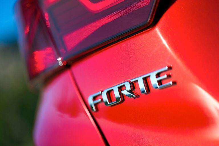 Zagięcia na masce przyczyniają się do muskularnego wyglądu Forte, a charakterystyczne cechy na przednim zderzaku, w tym świeże podejście do charakterystycznej osłony chłodnicy w kształcie nosa tygrysa oraz agresywna czarna dolna część, wzmacniają jego obecność i indywidualny charakter. Przedni zderzak jest flankowany przez reflektory w stylu Stinger. Oddzielne wskaźniki kierunkowskazów umieszczono na dolnej części przedniego zderzaka, gdzie kurtyny powietrzne poprawiają aerodynamikę i zwiększają techniczny urok Kia Forte. Z tyłu zderzak tylny otrzymuje podobne traktowanie, z oddzielnymi wskaźnikami wstecznego i kierunkowskazów umiejscowionymi pod dostępnymi lampami LED. Podobnie jak w kompaktowym crossoverze Sportage, smukły poziomy element ozdobny łączy lampy tylne.