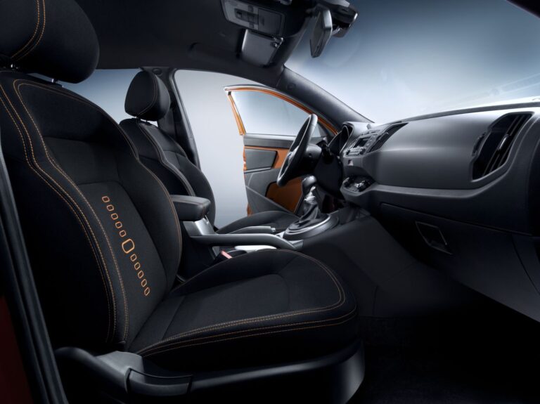 Wnętrze nowego Kia Sportage jest standardowo wykończone czarnym materiałem – a niezwykle można zamówić całkowicie czarny sufit. Opcje obejmują wykończenie częściowo skórzane oraz w pełni skórzane siedzenia, z wyborem kontrastowego przeszycia. Modele LX mają ciemnoszary kokpit i centralną konsolę, a opcje kolorystyczne obejmują średni szary, jasny alpejski oraz pomarańczowe wstawki w drzwiach, plus alpejskie metaliczne wykończenie konsoli centralnej.