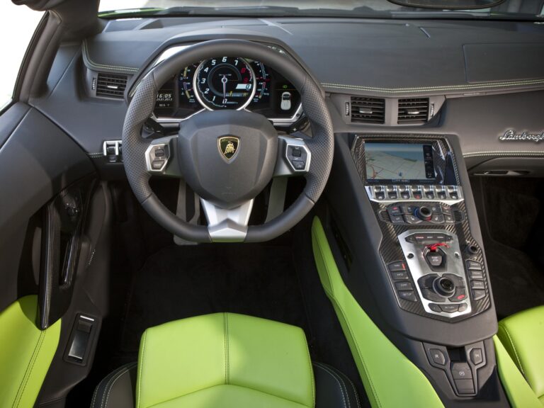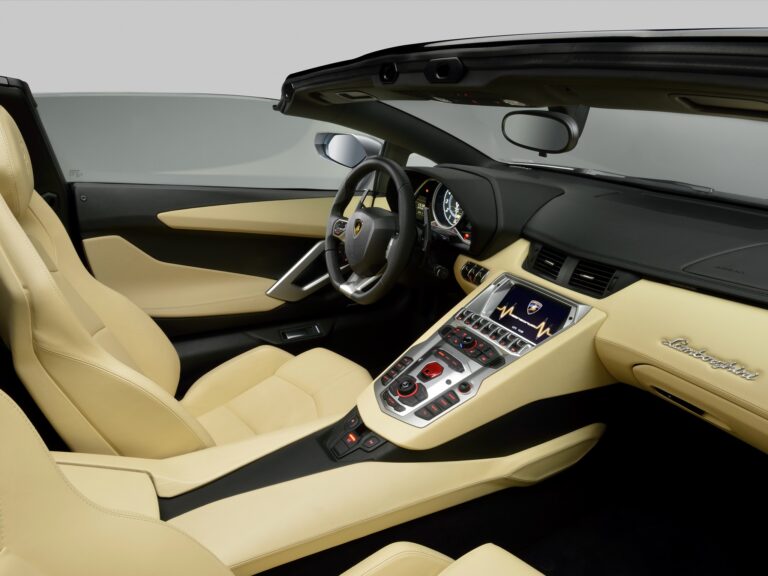 Nawet wnętrze ma nowy wygląd. Użycie skóry o nazwie Sabbia Nefertem podkreśla doskonałe rzemiosło tapicerskie z Sant’ Agata Bolognese i idealnie komponuje się z zewnętrznym kolorem Azzuro Thetis. Wreszcie, nowy Aventador LP 700-4 Roadster ma również nowe obręcze Dione 20″/21″ o odważnym, agresywnym wyglądzie. Wykonane z lekkiego aluminium prasowanego, obniżają wagę pojazdu o 10 kg w porównaniu do standardowego zestawu obręczy.