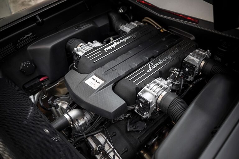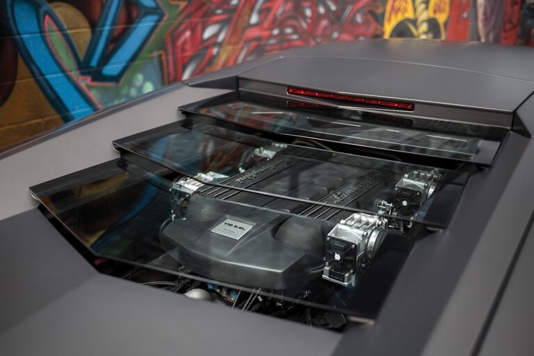 Klapa silnika wykonana z laminatu szklanego z otwartymi szczelinami wentylacyjnymi odsłania bijące serce dwunastu cylindrów supersamochodu. Szkło posiada również wyraźny kąt strzały, który charakteryzuje design od przodu do tylnego spojlera. Miłość projektantów Lamborghini do detali doskonale ilustruje klapka wlewu paliwa: małe dzieło sztuki mechanicznej, uzyskane przez frezowanie solidnego bloku aluminium.