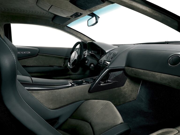 Oczywiście, obie drzwi Reventón otwierają się ku górze – od legendarnych Countach to także symbol linii produktów V12 Lamborghini. Ich asymetryczna konfiguracja, duże wloty powietrza pod drzwiami, stanowią przykład ekstremalnej spójności, z jaką Lamborghini spełnia swoją funkcję: po stronie kierowcy jest duży, aby zwiększyć przepływ oleju do chłodnicy. Po stronie pasażera, wlot powietrza jest płaski, ponieważ w tym przypadku ma tylko zapewnić przepływ pod podłogą. Aerodynamicznie zoptymalizowana struktura płaskiego podłogu kończy się z tyłu dyfuzorem o wyraźnym kształcie. Gwarantuje to doskonałą przyczepność na drodze i stabilność nawet przy 340 km/h.