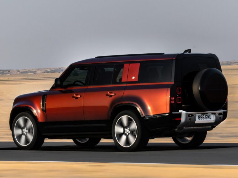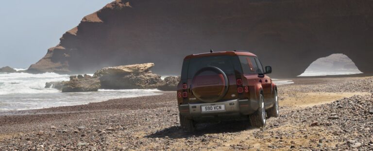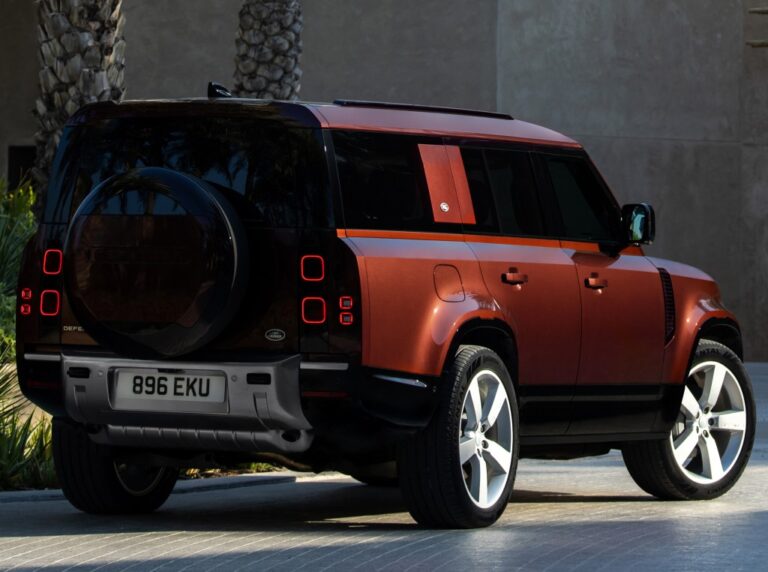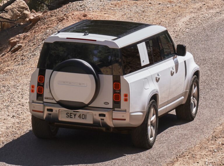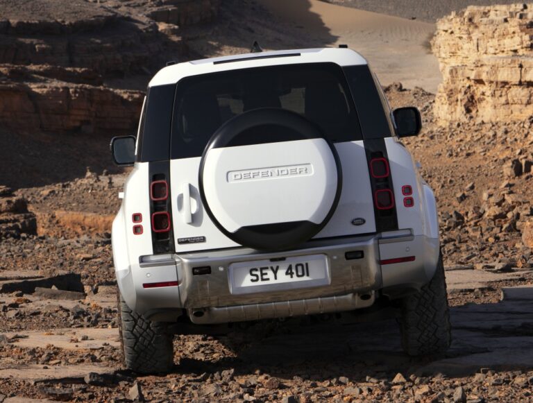 Aby zachować charakterystyczny tylny design Defendera, inżynierowie Land Rovera stworzyli subtelne uniesienie w stylu łodzi, które również maksymalizuje niezrównaną zdolność terenową, jakiej klienci oczekują od Defendera, zapewniając kąt najazdu o 28,5 stopnia. Otoczenie tylnych jednostek oświetlenia LED zostało przekształcone, aby zachować trzy wyraźne linie, które definiują boczny profil Defendera, delikatnie unosząc się w kierunku tyłu.
