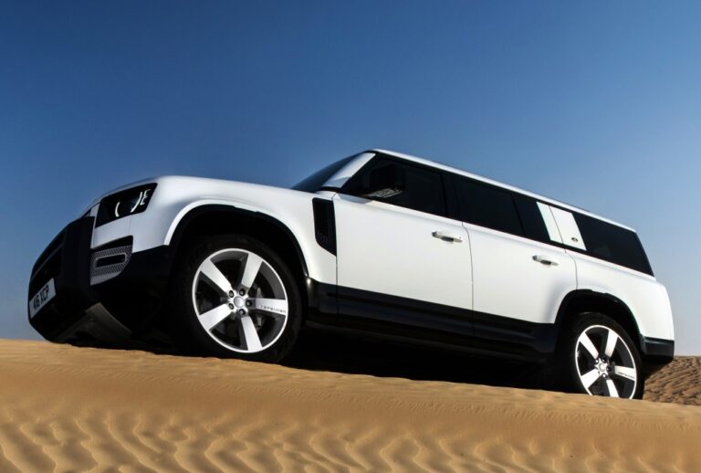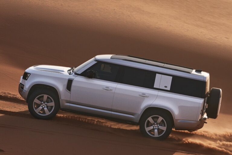 Wewnątrz największa zmiana, oczywiście, dotyczyła tyłu. Land Rover zainstalował trzeci rząd siedzeń, z wystarczającą ilością miejsca dla trzech dorosłych, co uczyniło z niego pojazd ośmioosobowy. I ostatnia, ale nie mniej ważna rzecz, przestrzeń bagażowa była więcej niż wystarczająca. Oferowała do 2,516 litrów (88,8 cu-ft) miejsca w porównaniu do 2,380 litrów (84 cu-ft) dostępnych w Defender 110. Podobnie jak jego „rodzeństwo”, SUV oferował standardowy system infotainment Pivi Pro z ekranem dotykowym o przekątnej 11,4″, z aktualizacjami OTA (over the air).
