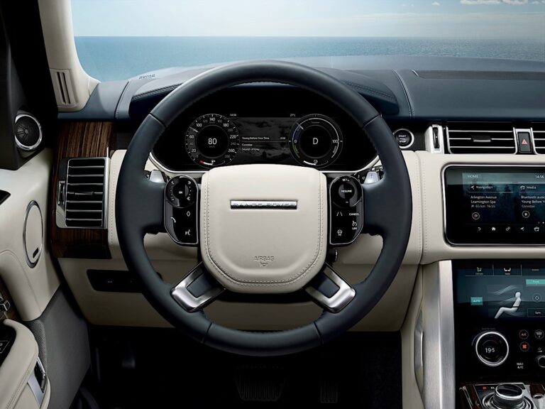 Wnętrze pojazdu zostało zaprojektowane z najwyższymi luksusowymi dodatkami. Rolety przeciwsłoneczne otwierały się i zamykały gestami przed lusterkiem wstecznym, a nie przez pociąganie za pasek lub naciśnięcie guzika. Producent zainstalował dwa 10-calowe ekrany dotykowe na centralnym panelu do systemu infotainment i jednostki kontroli klimatu, a inny ekran zastąpił analogowy zestaw wskaźników. Dla prawdziwego mobilnego biura, Land Rover wyposażył Range Rovera PHEV w 17 portów do podłączenia wewnątrz kabiny, w tym gniazdko domowe dla drukarki, jeśli zajdzie taka potrzeba.