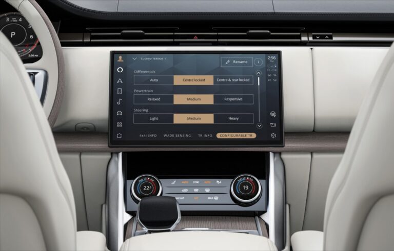 Nowy Range Rover podnosi nagradzane technologie infotainment Pivi Pro Land Rovera, posiadając największy dotychczas ekran dotykowy. 13,1-calowy zakrzywiony, unoszący się ekran ucieleśnia architektoniczną lekkość wnętrza z minimalistycznym designem ramy. Zapewnia intuicyjną kontrolę nad wszystkimi głównymi funkcjami pojazdu, korzystając z najnowszej technologii konsumenckiej, aby dostarczyć interfejs inspirowany smartfonami, połączony z wygodnymi fizycznymi przełącznikami do sterowania klimatyzacją.