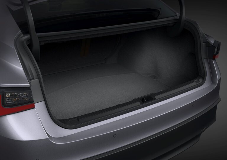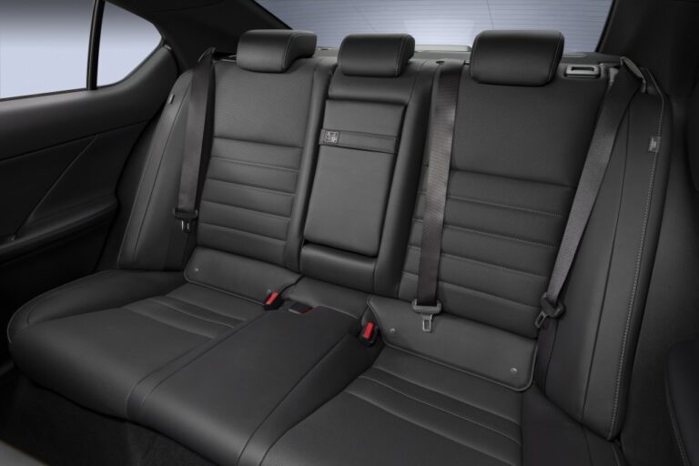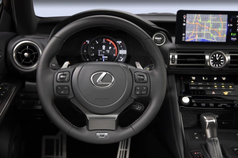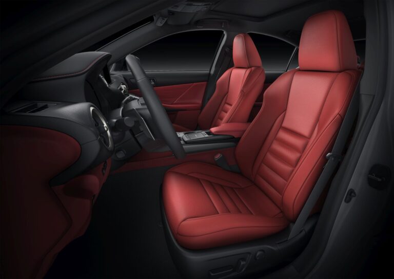 Wewnątrz nowego IS, stalowe płyty ochronne zdobią progi drzwi. Oczy natychmiast przyciągają stylowe fotele F SPORT, zwłaszcza gdy są pokryte dostępną nową opcją Circuit Red. Fotele przednie oferują również standardowe funkcje podgrzewania i wentylacji. Podgrzewana kierownica pokryta skórą z unikalnym ornamentem centralnym, perforowana dźwignia zmiany biegów oraz zestaw wskaźników F SPORT czekają na kierowcę, podobnie jak unikalny pedał przyspieszenia F SPORT, pedał hamulca i podnóżek. Charakterystyczne fotele przednie oferują dwukierunkowe elektryczne wsparcie lędźwiowe oraz czterokierunkowe regulowane zagłówki. Unikalne akcenty drzwi F SPORT wyróżniają się czarnym geometrycznym filmem otaczającym przełączniki okien. Aktywny system kontroli dźwięku został poprawiony, aby jeszcze bardziej wzmocnić ekscytujące dźwięki silnika V6, jednocześnie redukując nieprzyjemne tony.